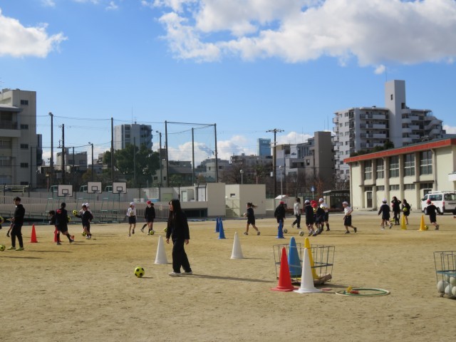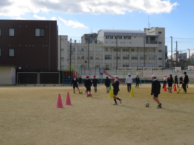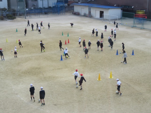 体育の授業の様子です。運動場でサッカーをしていました。運動場いっぱいに広がってパスをしていました。寒くなると、サッカーがいいですね。