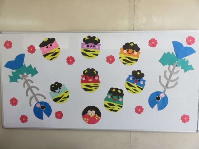 2月の給食室の掲示です。元気な鬼の豆ですね。みんなもこの豆のように、元気に厳しい冬をのりきりましょう。