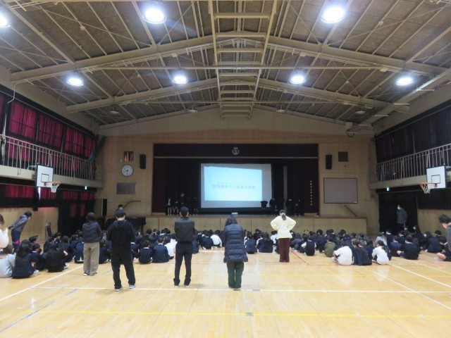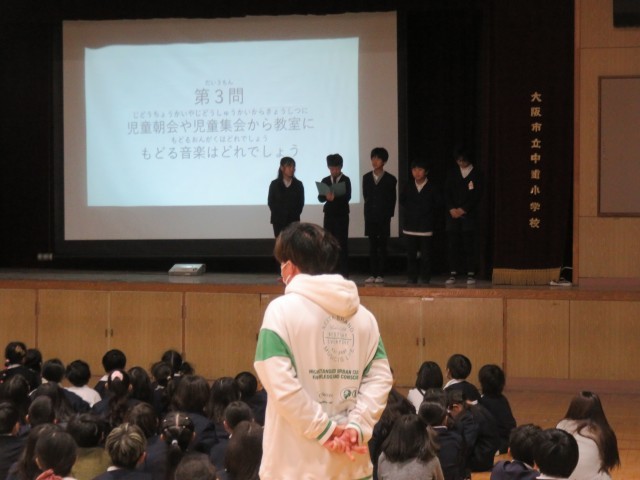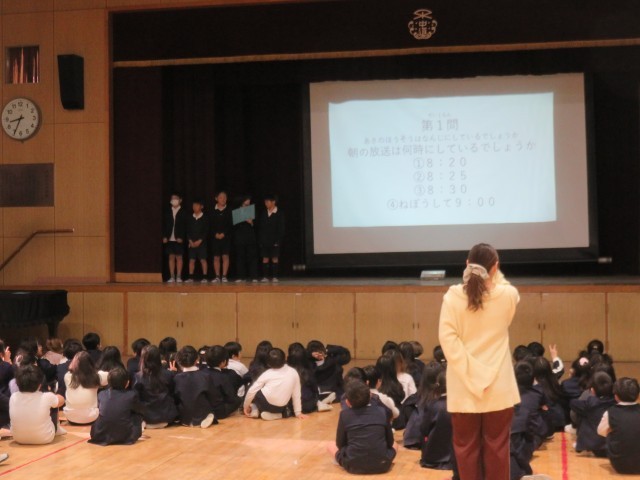 講堂で、児童集会を行いました。今日は、情報委員会の集会でした。情報委員会の日常の活動を動画で紹介しながら、クイズを織り交ぜた楽しい集会でした。全校児童が、情報委員会の毎日の活動を知ることができました。