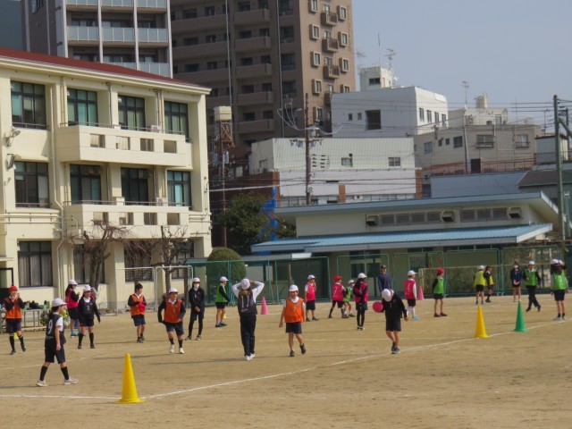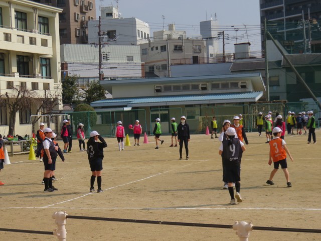 体育の授業の様子です。サッカーをしていました。寒さも和らぎ、風も穏やかな中での運動場でのサッカーは、楽しいですね。