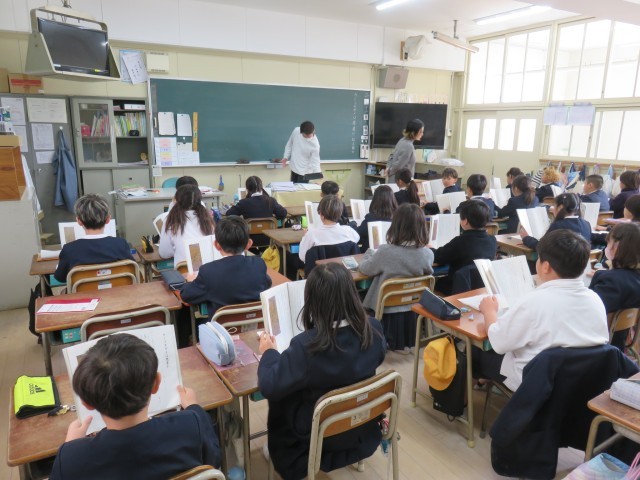 国語の授業の様子です。説明文「カミツキガメは悪者か」の単元を学習していました。とてもよい姿勢で、一斉読みをしていました。これから音読の宿題として声に出して読むことになるのでしょうね。内容を深く読み込むのに必要な学習ですね。しっかり音読しましょう。
