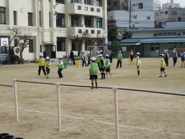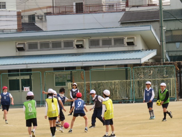 体育の授業の様子です。サッカーをしていました。全体で練習をして、チームごとに分かれて試合形式で練習をしていました。みんなしっかり体を動かしていました。