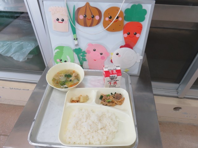今日の献立は、豚肉と干しずいきのみそ煮・五目汁・焼きじゃが・ごはん・牛乳です。