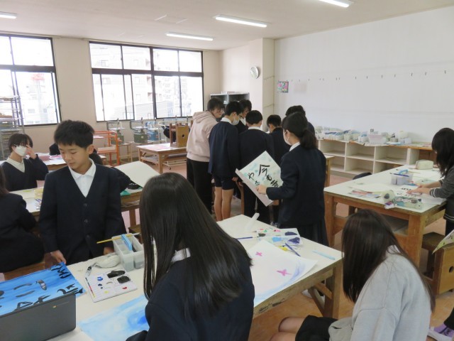図画工作科の授業の様子です。図工室で文字を使ったアート作品を表現していました。画用紙に言葉とその言葉にふさわしい背景を描いていました。見ながら感心する絵がいっぱいありました。流石6年生ですね。