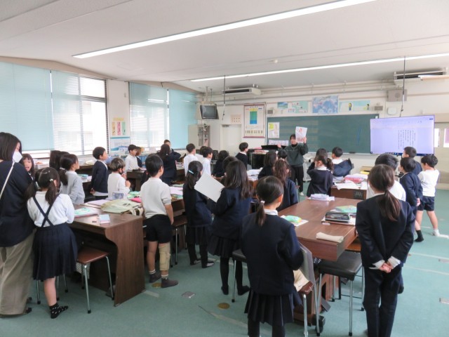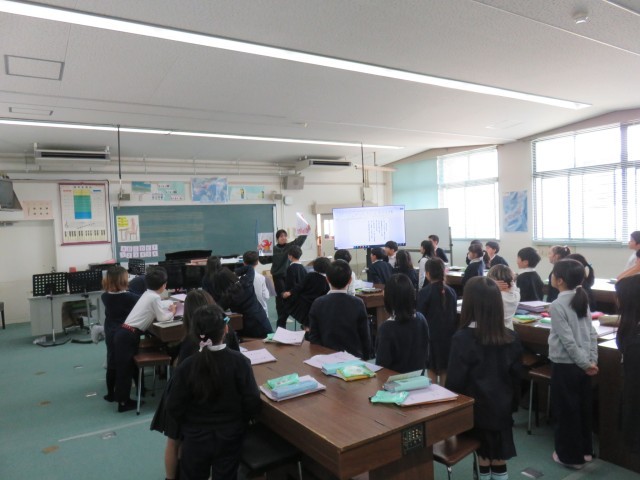 音楽の授業の様子です。歌唱指導前の発声練習をしていました。天使と怪獣のいらすとをつかって、天使の優しい声を出したり、怪獣になって大きなうなり声を出していました。子ども達は、頭声発声や大きな声を出すことを自然にしていました。工夫された発声練習でした。