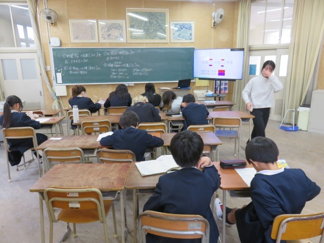 算数の授業の様子です。習熟度別少人数で学習をしていました。速さの学習をしていました。自足・分速・秒速の単位の変換をしていました。大きい桁の掛け算・わり算の計算が必要なので、難しいですが、1つずつていねいに解いていきましょう。それが解くコツだと思います。