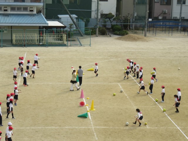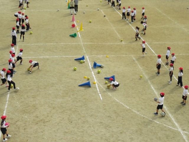 体育の授業の様子です。運動場でボール遊びをしていました。ボールをけるゲームをしていました。コートの中央に置いてあるコーンをけって倒すゲームです。正確に強くけらないと、コーンは倒れませんね。がんばりましょう。