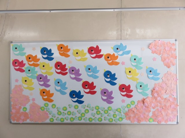 給食室の掲示物が、3月に替わりました。飛翔を表していますね。桜やお花に見守られながら、一つの方向を目指して27羽の鳥が羽ばたいています。子ども達の未来を象徴しています。とっても素敵な掲示です。