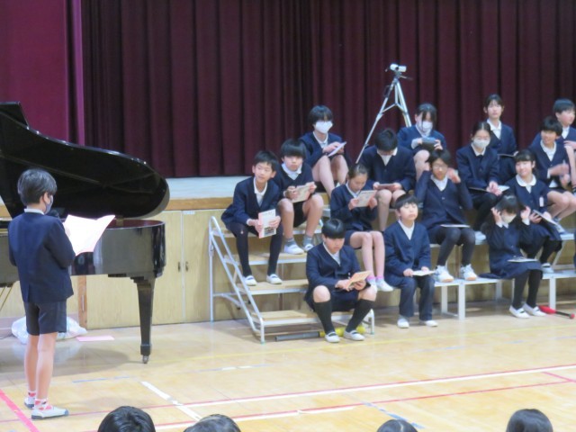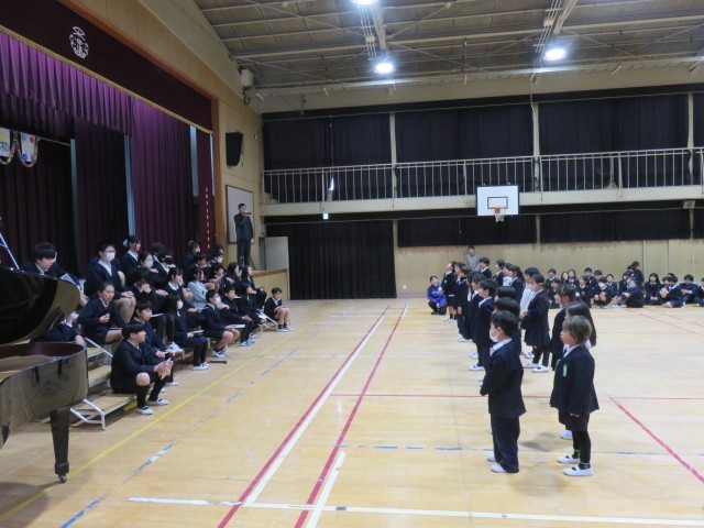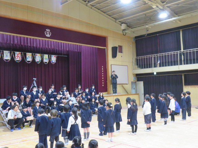 児童会の代表によるあいさつに続いて、各学年からの出し物が披露されました。1年生からのプレゼントの様子です。