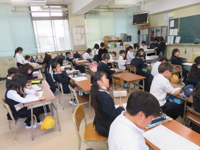 算数の授業の様子です。3年生の復習のプリントをしていました。その場で採点をしているので、直後に間違い直しができるのでいいですね。間違ったところは、正解をしっかりと覚えておきましょう。