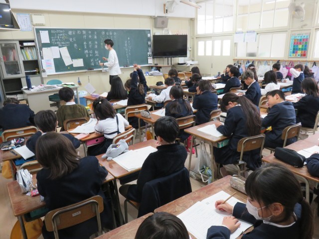 総合的読解力の学習をしていました。食品ロスについて考えていました。冊子に自分の考えを書いていました。3年1組から画期的な提言がなされ、それが世界に波及していくといいですね。期待しています。