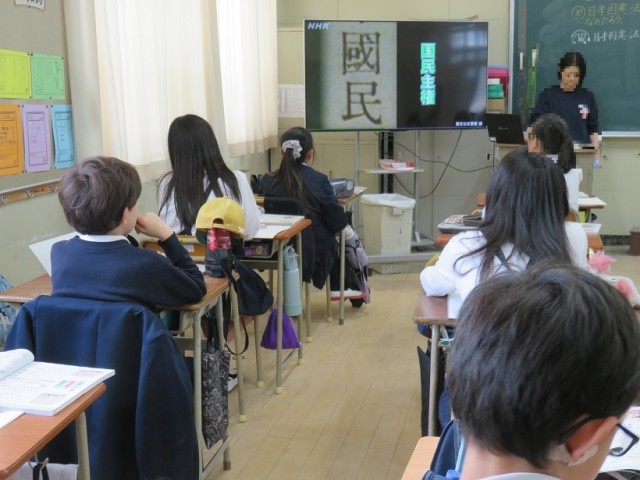 6年生の社会科の学習です。日本国憲法の三原則「国民主権」「基本的人権の尊重」「平和主義」について確認しました。