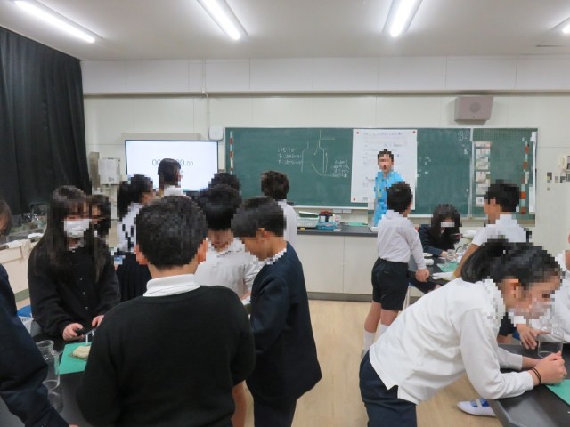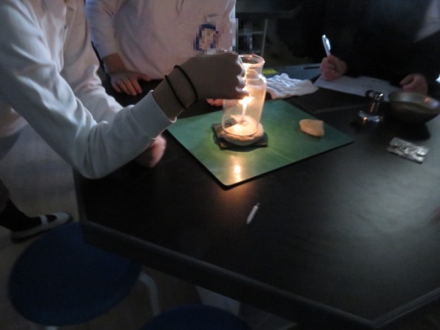 理科室では、6年生が実験をしていました。「ものの燃え方と空気のうごき」の実験です。平らにしたねんどにろうそくを立てて、火をつけ、線香の煙を近づけて空気の動きを調べました。