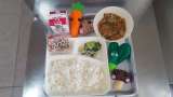 今日のメニューは、サーモンフライ・豆乳スープ・キャベツのカレーソテー・パン・牛...