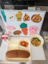 今日のメニューは、えびのチリソース・中華スープ・スライスチーズ・黒糖パン・牛乳...