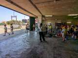 いかだ体験の様子です。説明を聞いて、今から、いかだを作りに行きます。