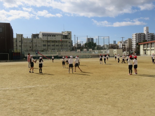 体育の授業の様子です。運動場でドッジボール大会をしていました。寒い日だったので...