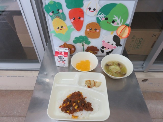 今日の献立は、ビーフケチャップライス・フライドポテト・キャベツのスープ・ダイス...