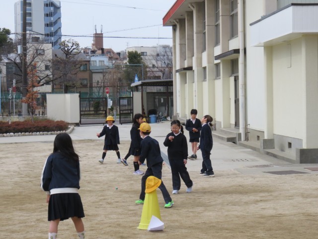 体育の授業の様子です。運動場でリレーをしていました。バトンわたしの練習を重ねた後...
