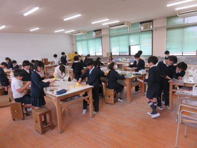 図画工作科の授業の様子です。図工室で、木工工作をしていました。教材の木を切ったり...