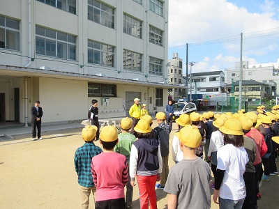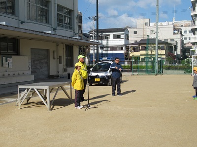 4月15日(月)朝礼の時間に東成区で本校を担当する安パト隊の方に来ていただき、子どもたちに紹介しました。