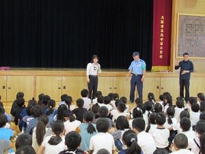東成警察の方にご協力いただき、不審者役をしていただいたり、避難後、不審者から自分の身を守るためには、どうすればよいのか話をしていただいたりしました。
