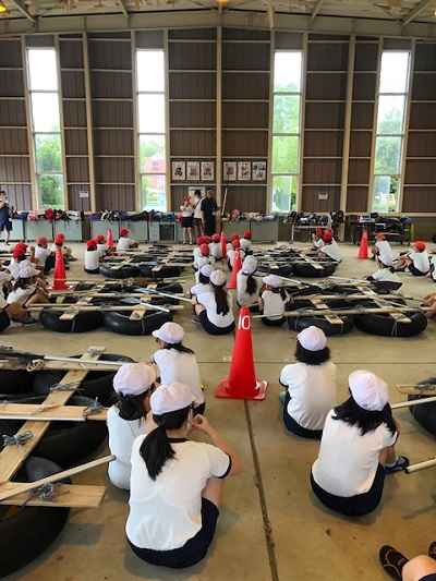 午後からのプログラムとして、いかだを自分たちで作り、乗り方など説明を聞いたあと、協力して運び移動させました。
