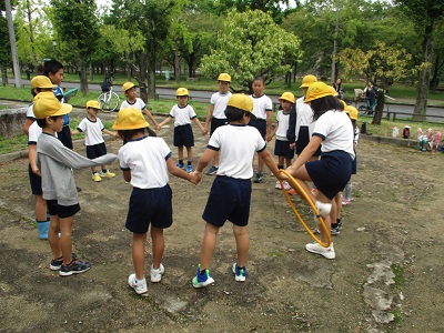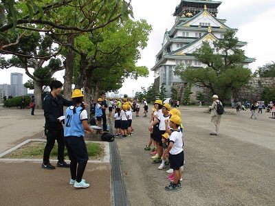 たて割り班に分かれて、5つのポイント(桃園、狛犬前、青屋門、天守閣入口、記念樹の森)でゲーム(人の輪くぐり、クイズ、じゃんけん、ジェスチャー、ボール運び)に挑戦しつつゴールをめざしました。