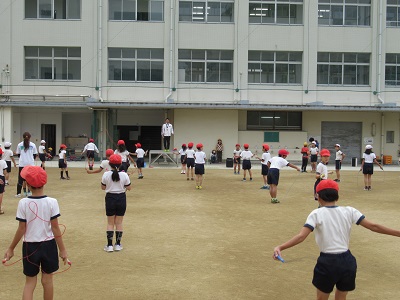 なわどびの指導員の方に来ていただき、2時間目は1,2年生、3時間目は3,4年生、4時間目は5,6年生が、縄跳びをする時のリズム、手の動かし方など具体的に教えていただきました。