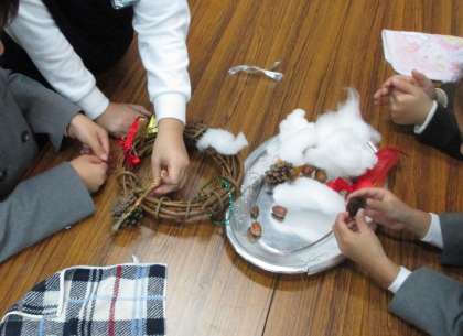12月3日火曜日、1年生は地域の子育てサークルに参加されている方と共に、クリスマスリース作りを行ないました。