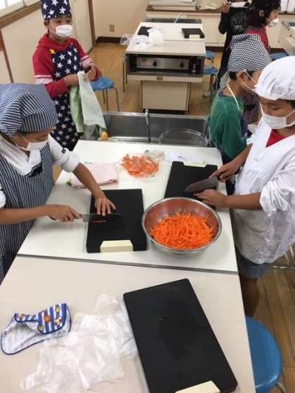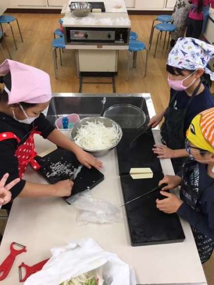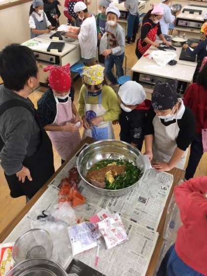 今日は4年生の国際理解教育の調理実習を行いました。班ごとにキムチの味の素となる「ヤンニョム」の具材を切ったりすったりした後、塩漬けした白菜に塗り込んでいきました。おいしくできるかな?