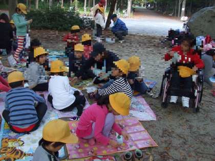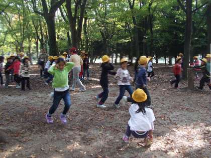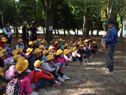 子ども達は紅葉が始まっている大阪城公園でゲストティーチャーに地域の福島啓視さんを迎え、知識や年齢に関係なく五感を使って自然を直接体験できるゲームを楽しみました。