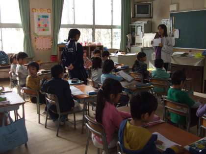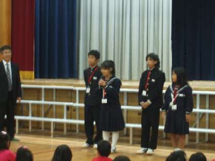 初日には、職員室や児童集会で緊張の面持ちでしたが、しっかり自己紹介していました。その後は、管理作業員さんの仕事のお手伝いをしたり、配置された学級で担任の先生の指導ぶりを学びました。