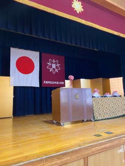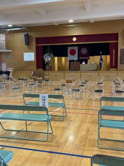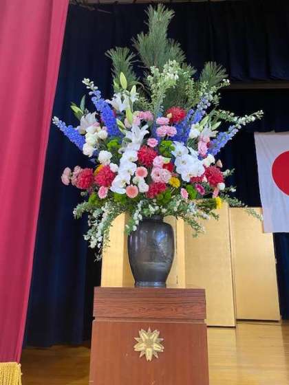 講堂のお花もとても豪華です。講堂の椅子も消毒作業していました。