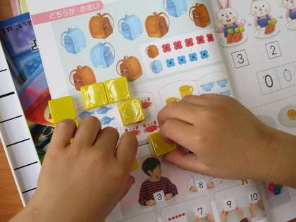 左の写真は、1年生算数科「どちらがおおい」の学習の様子です。教科書にある魚とカニの絵を、算数ブロックに置き換えて考える方法を学びました。その後、数字の「0」を書く練習もしました。