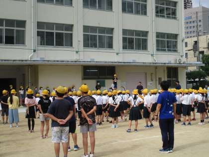 7月2日(木)、今年度初めての児童集会があり、代表委員会の児童と各委員会の委員長があいさつを行いました。