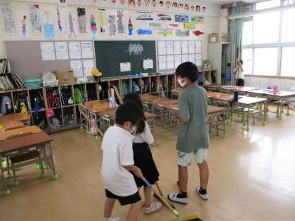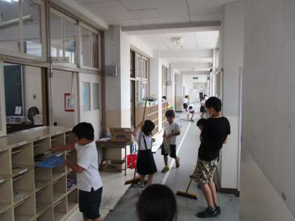 リーダーを中心に、担当場所に集合して、決めた役割に分かれて掃除をしました。6年生の児童が低学年の児童に、ほうきの使い方を教えている場面も見られました。どの班も担当場所の掃除をしっかりがんばっていました。