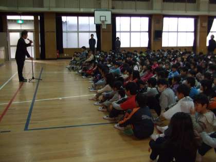 写真上)体を話し手の方に向けて校長先生の話を聞いています。
