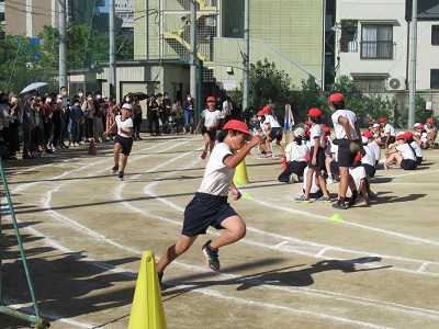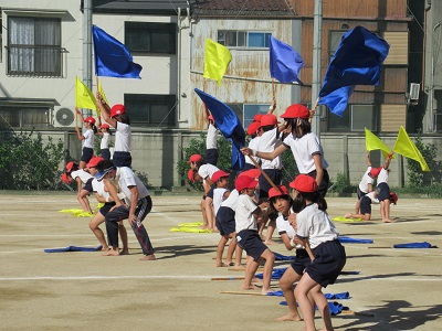 個人走は、学年ごとに行い、団体演技は5,6年生が一緒にフラッグの演技をしました。