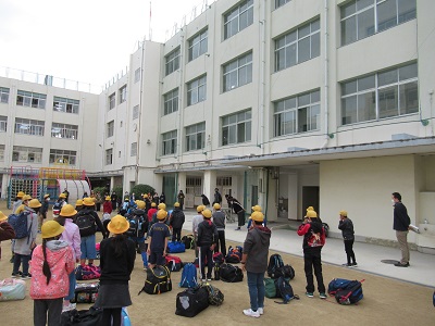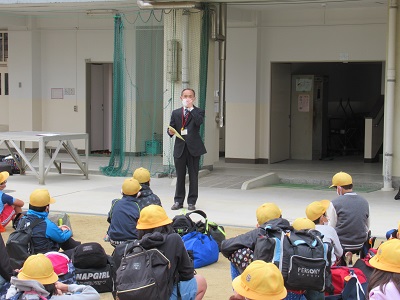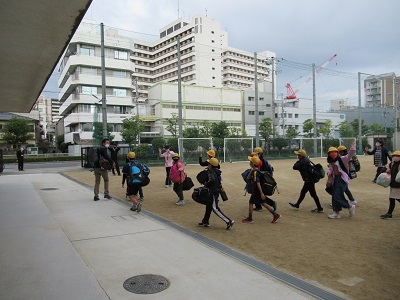 出発式を運動場で行い、大阪府立青少年海洋センターに向けて出発しました。