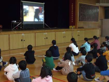 写真上)ビデオ発表を真剣に見入る子ども達