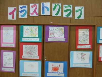 写真中)講堂に掲示されたイラストクラブのイラスト
