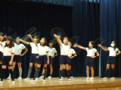 この1年間クラブ活動で創意工夫し活動してきた内容を全児童の前で発表しました。活動内容がよく分かるように予め撮影しておいたビデオでの発表をするクラブのほかに、イラストクラブは発表会会場の講堂に作品を掲示し、バトンダンスクラブは舞台発表でダンスとバトンの2つの演技を見せました。