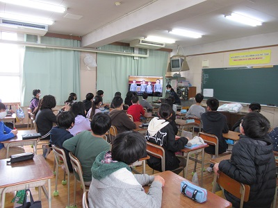 新型コロナウイルス感染予防のため、学校長の話は放送で聞き、各学年の出し物は事前に動画を撮り字幕を付けたものを各教室で見ることにしました。