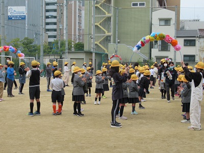 全校児童が運動場に集まり、在校生がお祝いのことばや歌を歌うことや6年生にプレゼントを渡すこと、6年生からお礼のことばと在校生へプレゼントを渡すことのみ行いました。