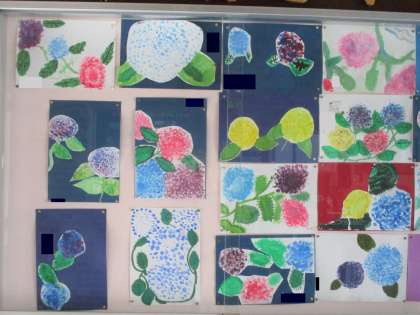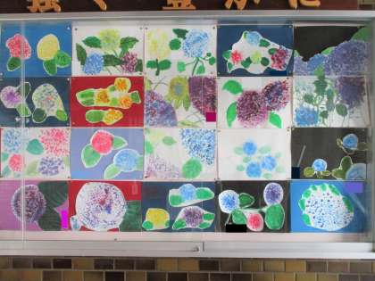 これは6年生が図工で描いた作品です。一枚一枚の花びらはどのようにして描いているのかわかりますか?