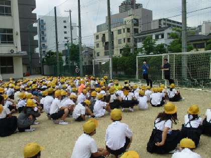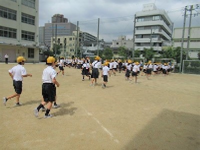 地震の発生の放送ではまずは頭部を守り、揺れがおさまるのを待ってから運動場へ避難しました。