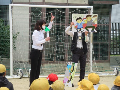 避難する時の注意として「移動中はしゃべらず、先生の指示を聞く」の確認のお話と、「1人で遊ばない・知らない人について行かない・大きな声を出して逃げる・だれとどこへ行きいつ帰るかをお家の人に伝える・友だちが連れて行かれそうになったら大人の人に知らせる」という5つの約束についてのお話を聞きました。