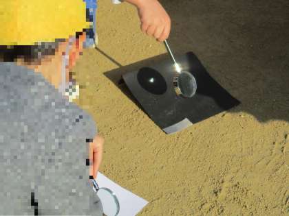 鏡ではね返した日光を重ねると明るさや温度がどうなるかを実験しました。また、虫めがねを使って画用紙に日光を集めて、その部分を大きさによる違いを確認しました。同じ場所に小さく集めると、黒い画用紙がこげるくらい熱くなることもわかりました。