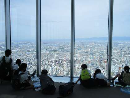 あべのハルカス展望台では大阪の街並みを一望できました。班に分かれて大阪の地形や様々な建物を見つけてワークシートにどんどん書き込んでいました。